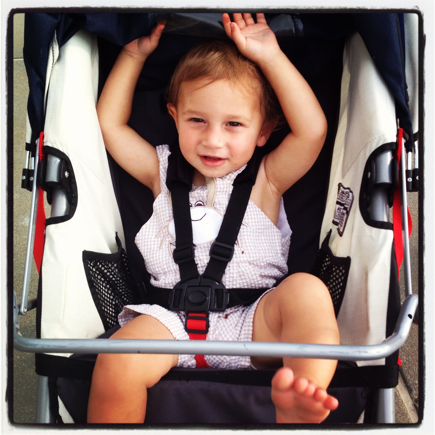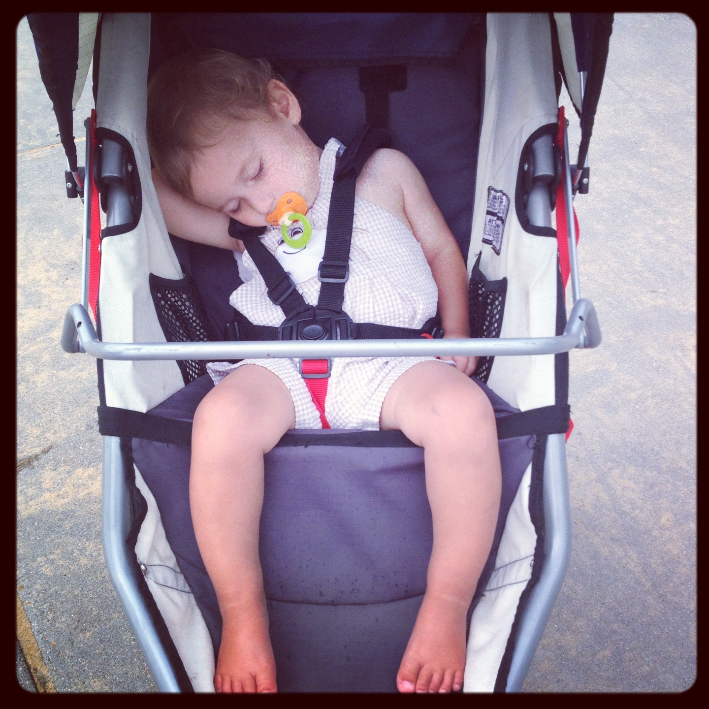 I took the route along the boardwalk because it had rained so much and there were puddles everywhere in the park, not to mention all the tree roots and rocks along the trail. Gus enjoyed seeing all the seagulls and pelicans, the people walking and biking, the dogs and of course the ocean. He chatted and sang to me as we ran along together. I am sure we were both smiling. At about 4 miles into the run he stopped chatting and I noticed he had completely dozed off. Two hours before his usual nap time. I guess the sound of my footsteps and the salty ocean breezes were just too relaxing for my little guy.