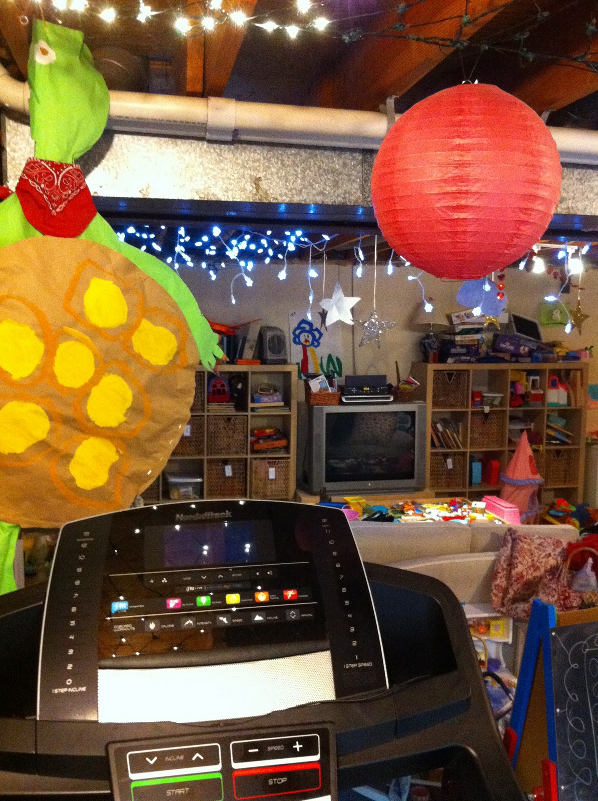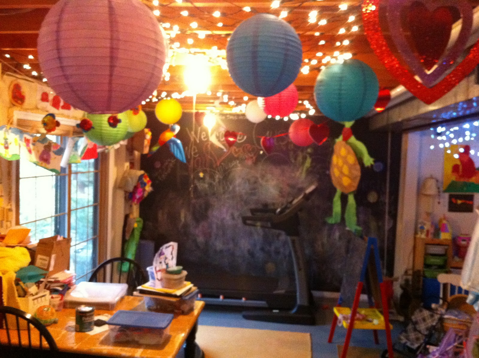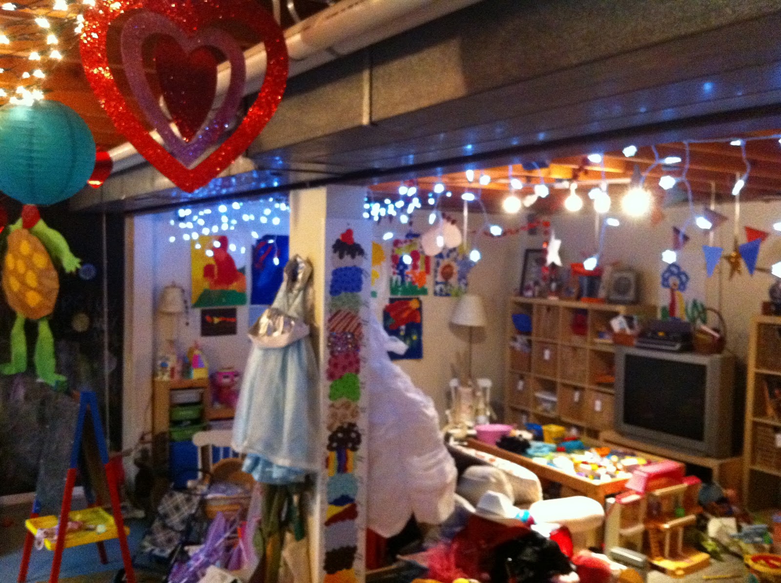 I was so excited to have a single family home with a basement. We could not afford to finish the basement though, so we worked with what we had and turned it into a place the kids would play and keep their toys. With some paint (including a chalkboard wall), twinkle lights, artwork made by my kids, lanterns from the dollar aisle and stars I made out of cardboard and glitter and hung from the ceiling with curling ribbon, the space was magically transformed into a world that would encourage and inspire my kids to use their imaginations.