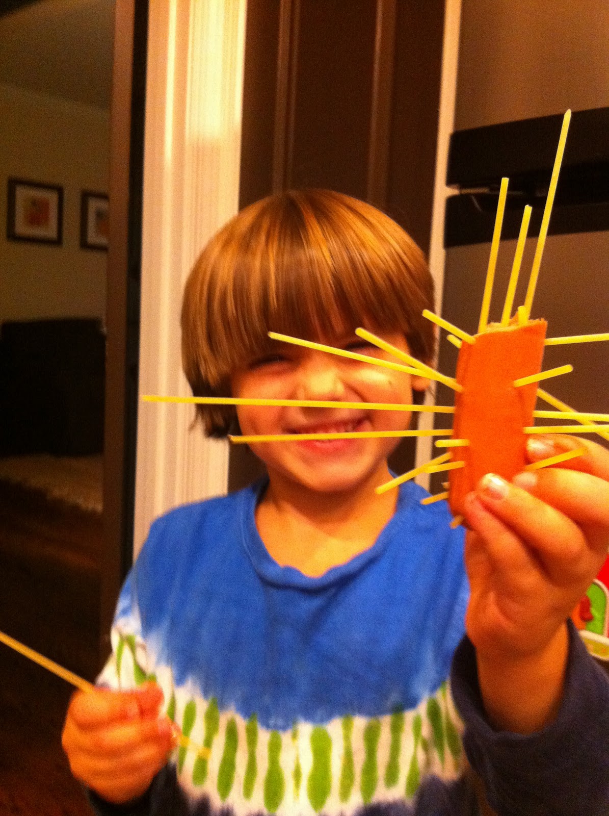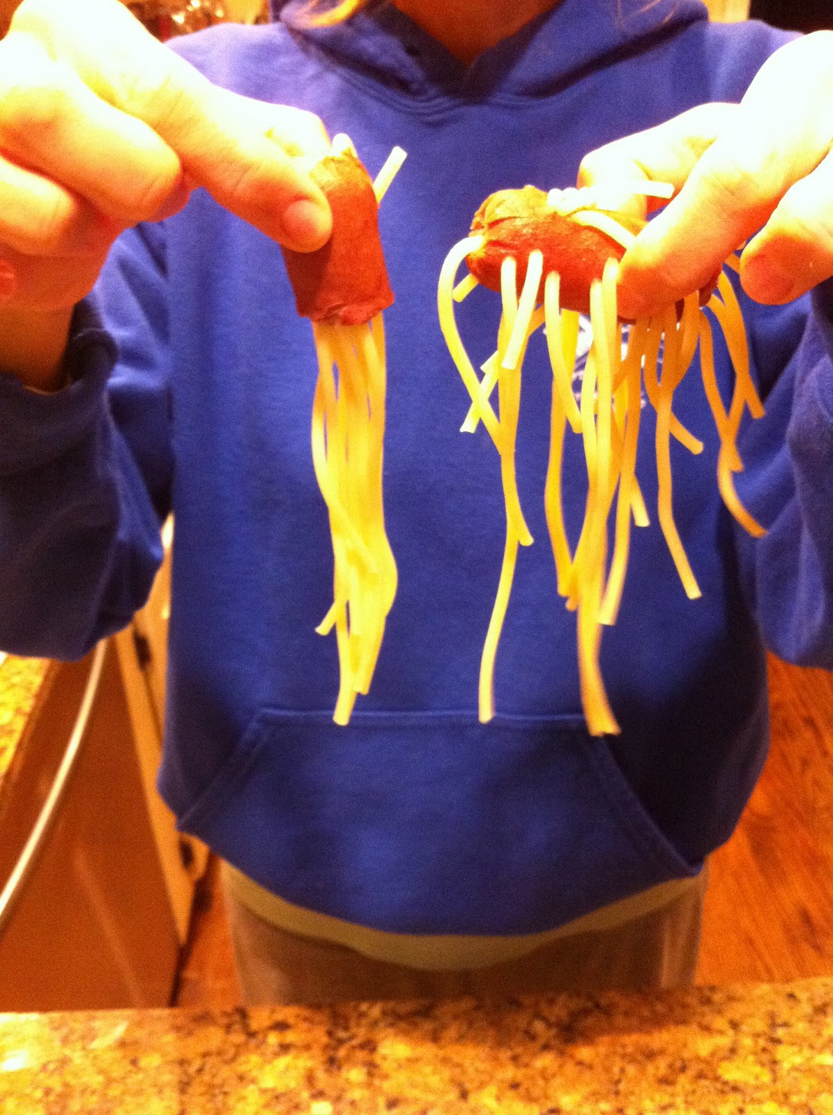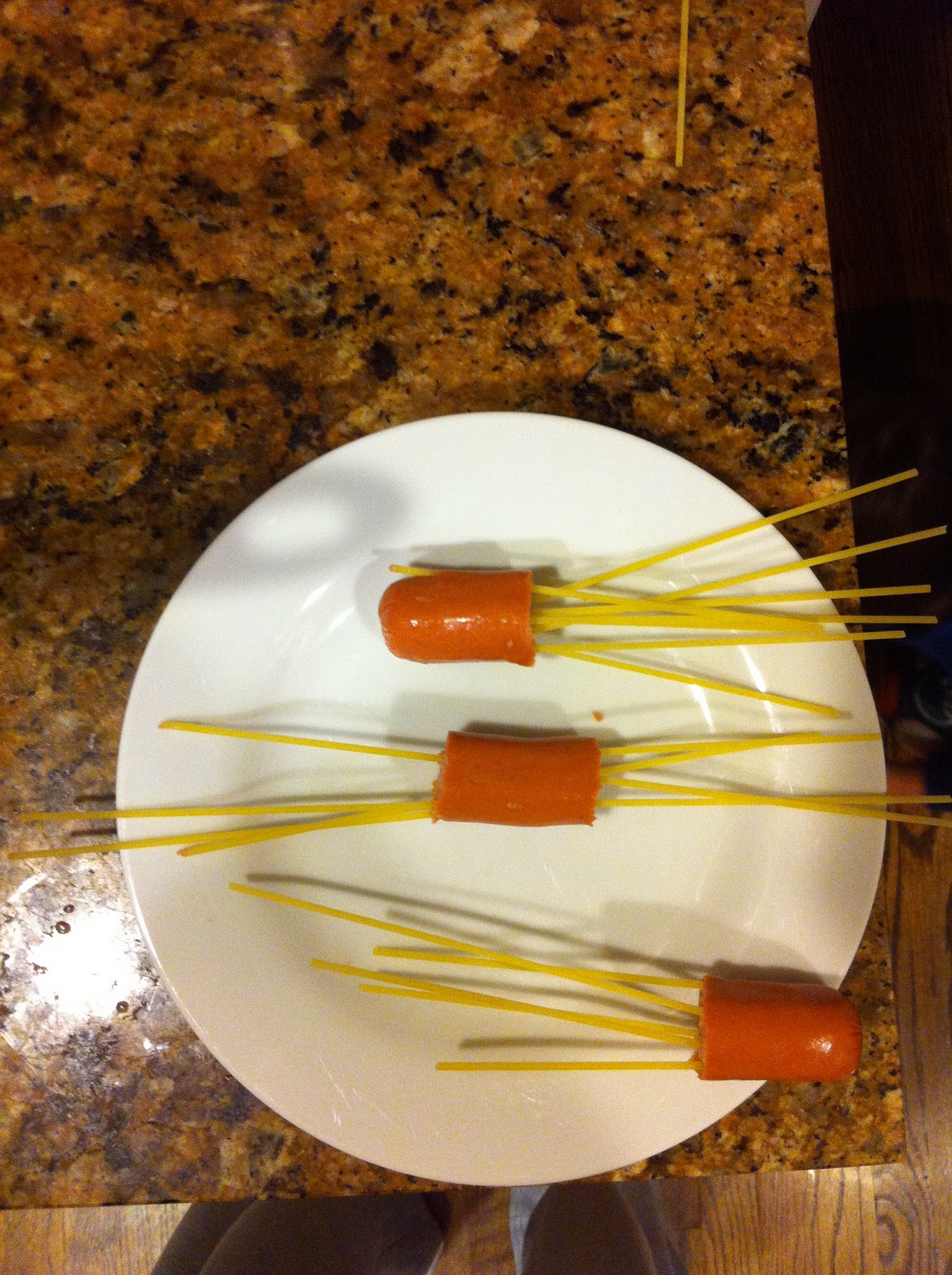 3. Stick spaghetti noodles into hot dog pieces. You can be creative with this – there is really no wrong way to do it as long as you just make sure the noodle is really stuck in there so it won’t fall out while cooking!