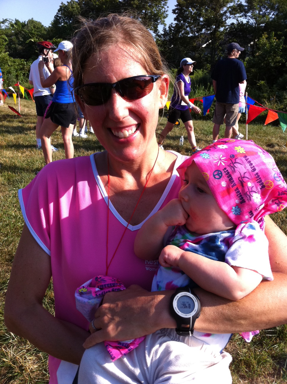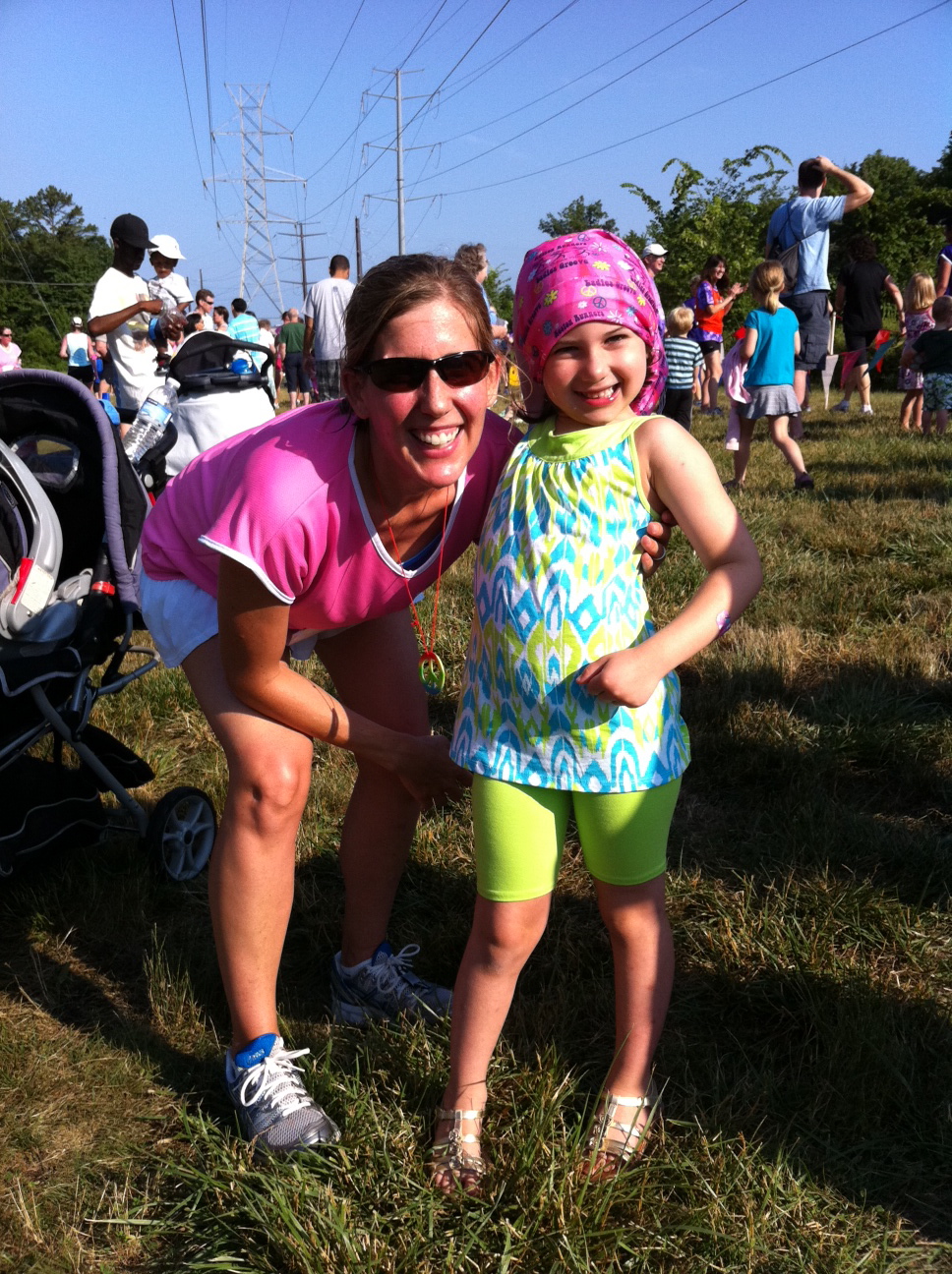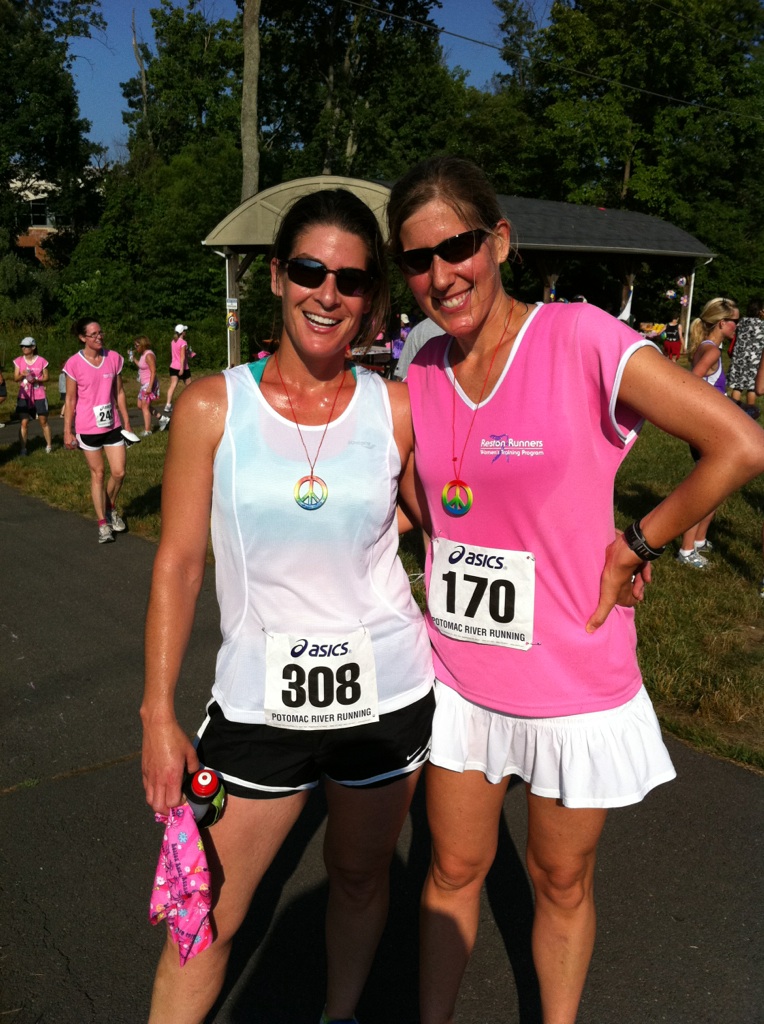 My goal going into this race was to PR – because I knew I could. My previous PR was 24:52 and that was set last month at the We’ve Got Your Back 5K also here in Reston. I wanted to have a sub-8:00 pace per mile but wasn’t sure how far under that I could be. I was thinking 7:30s should be do-able because the other night at the track I ran 4 miles at that pace. (There were 3-minute rest periods between my reps on the track, but I was not going “all out” that night and felt that for a 5K race I should be able to hold that pace without killing myself. I was right.) I maintained a steady pace of around 7:15 for the first two miles even with the sharp turns, hot sun and gravelly/woodsy terrain sections. Mile three was just plain HOT and I slowed down a little over the last hill but never gave in and felt strong. The last stretch was fun – I gave it more ooomph and pushed to the finish. When I was done I wondered though if perhaps I should have pushed harder that last mile because I felt like I had more in me when I crossed the finish. I do this a lot – especially when I see people crossing and nearly collapsing or puking – should I have pushed myself to that point? I think the answer is NO, not unless I wanted to! Which I did not. I was super-happy with my time and my performance and I was glad I wasn’t feeling like I could hurl because I got to see my husband and my kids and celebrate with them!