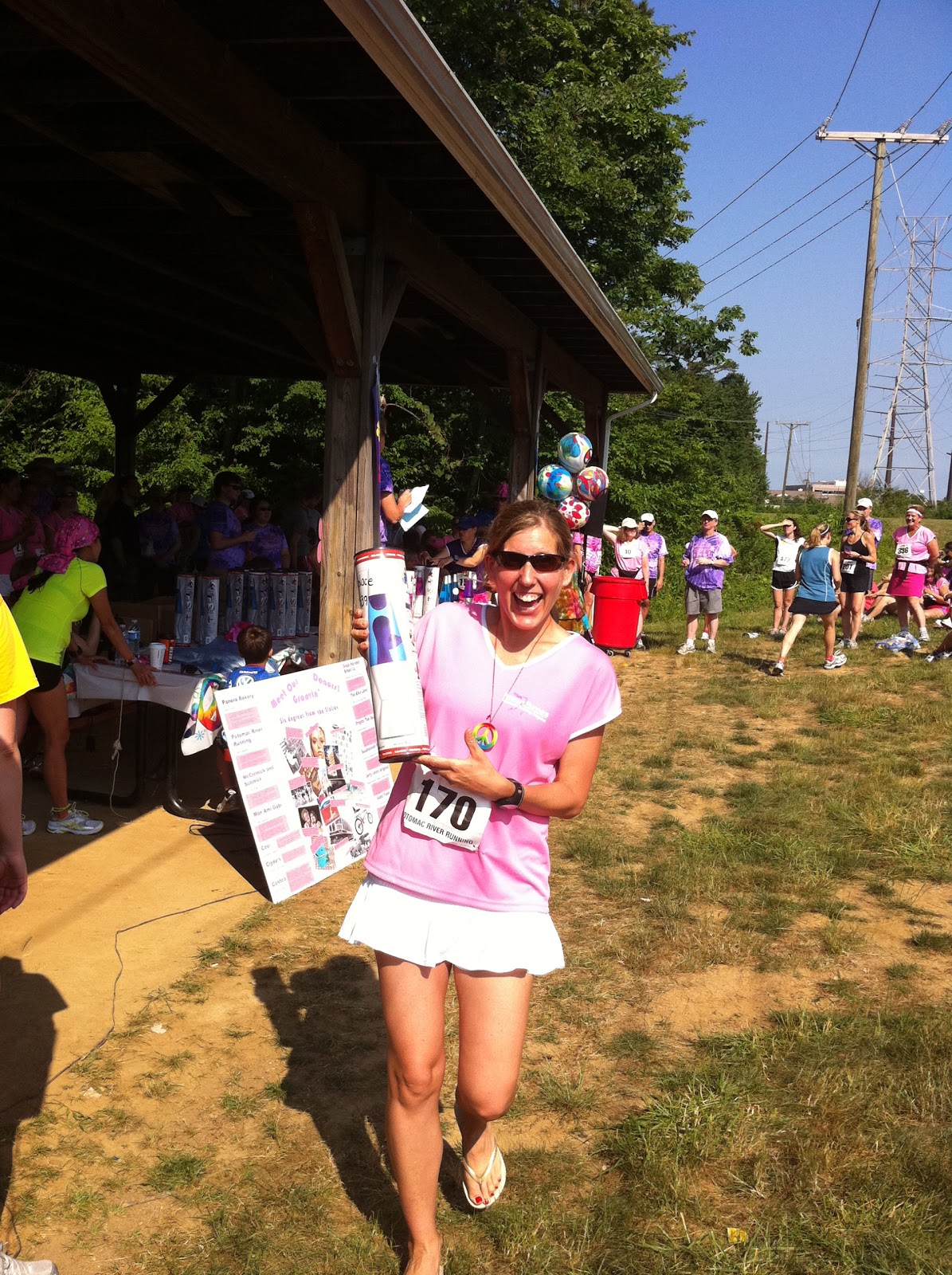 Groovy Facts: This is a women-only event! There were men volunteering along the course though – manning the water stations and telling us where to turn and what our splits were. Lots of men cheering us in at the finish too and even one man offering “hugs” in the finishing chute (this I found weird and next time I will try to spot him sooner so as to avoid the hug. Kinda creepy if you ask me). There were about 500 women registered today. The youngest participant was 5 years old and the oldest was 76. Many women also walked and there were awards for the walkers as well as for the runners, which I think is pretty cool. The race had a 60’s theme and everything was very groovy – peace signs everywhere, tie dye balloons and beach balls for the kids, 60s music playing at the finish. The trophies were lava lamps – soo fun! There was a whole lotta love going on. You just couldn’t help but smile – the atmosphere was totally fun.