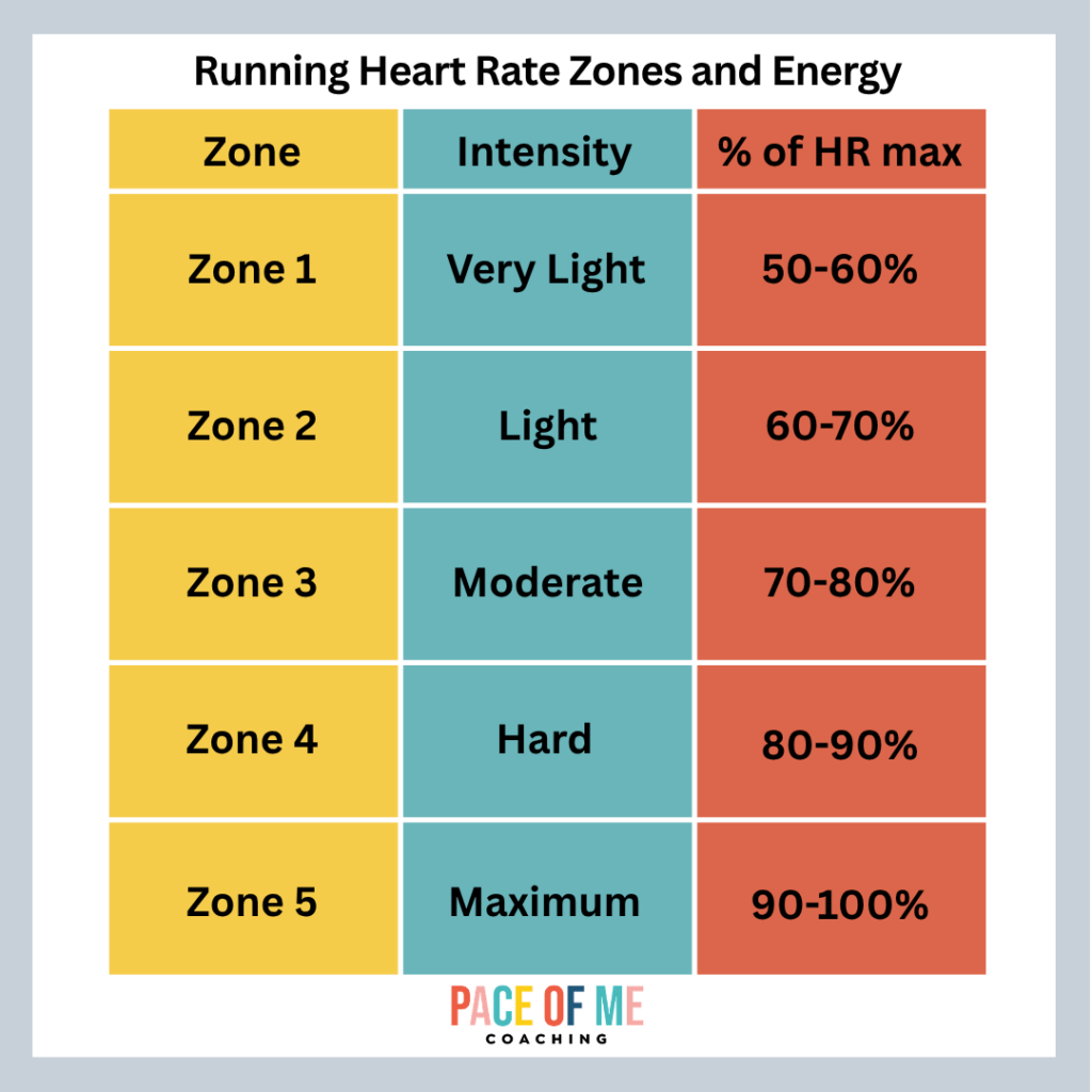 First off, let’s define what heart rate is and why it is important for runners to consider. HR is the number of times your heart beats per minute (bpm). It measures fitness and cardiovascular health. Yes it’s important, but it is not the best training tool if you aren’t factoring in other points of consideration. Below are the HR zones and energy exertion percentages.