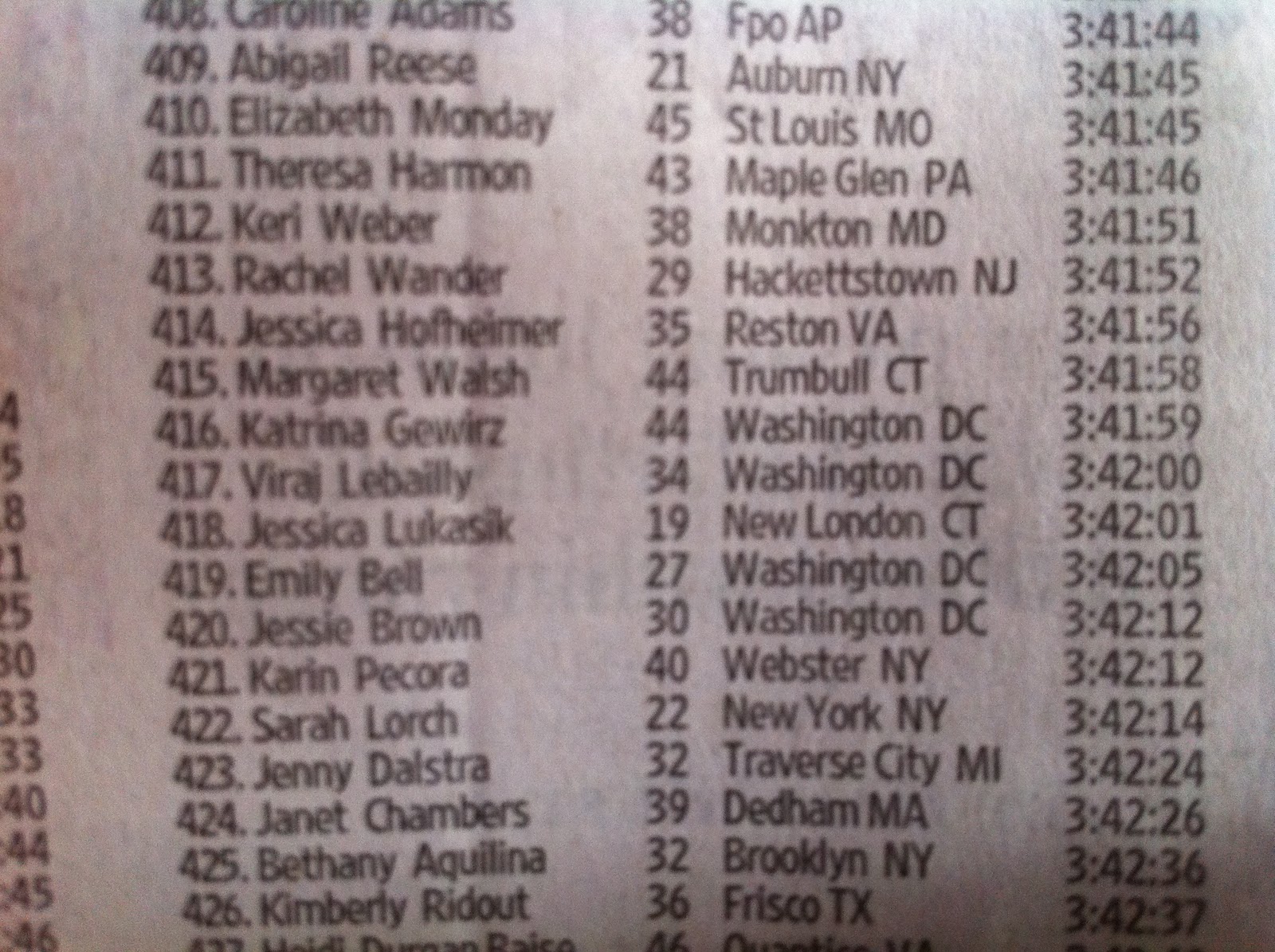I was 414th out of 8,530 female runners. My name was even in the Washington Post this morning (they published the top 500 men and top 500 women). This may sound silly, but when Robert showed it to me I jumped across the kitchen (sore legs and all), giddy with excitement, to see. My kids cheered for me and it was a really happy moment for all of us. I was beaming. Still am.