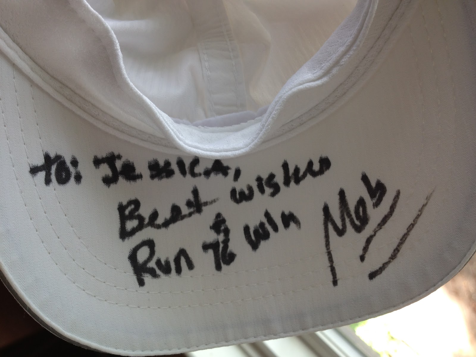 I asked Meb to sign the inside of my favorite running hat, so that when I am wearing it I can look up and read his words and remember this day.