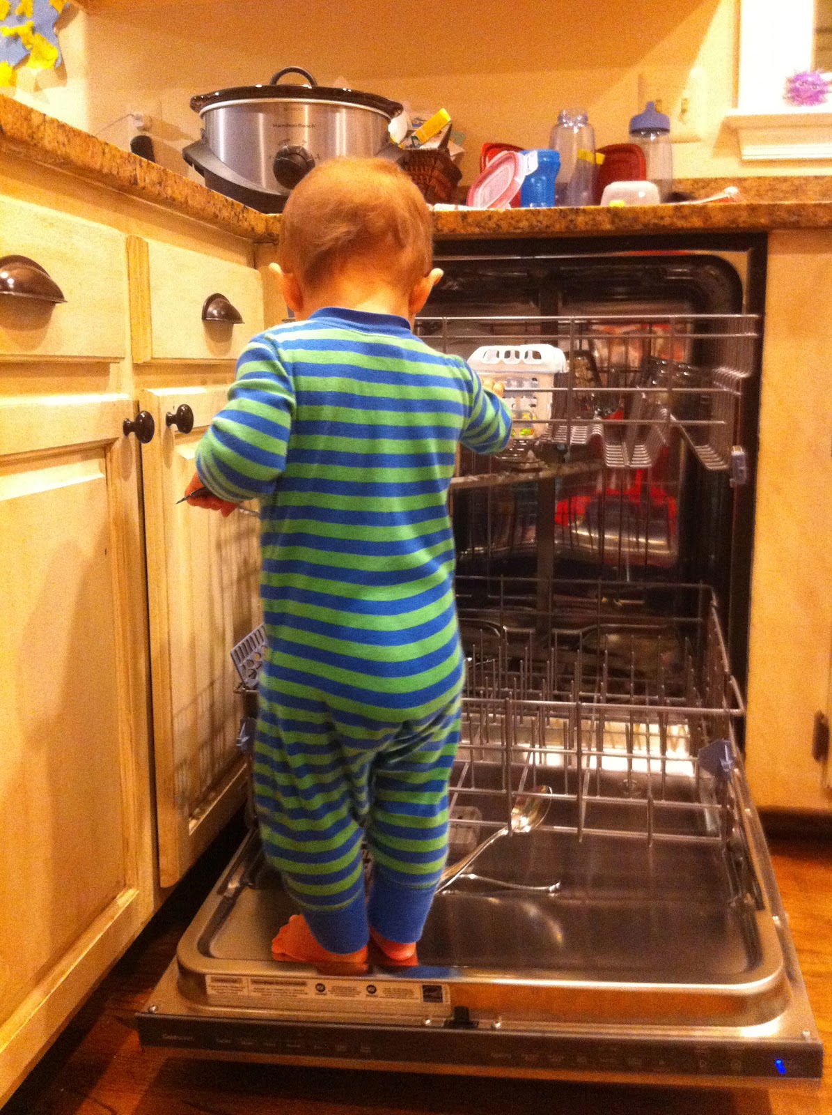 Standing in the dishwasher as I try to empty it during the chaos of our morning routine: