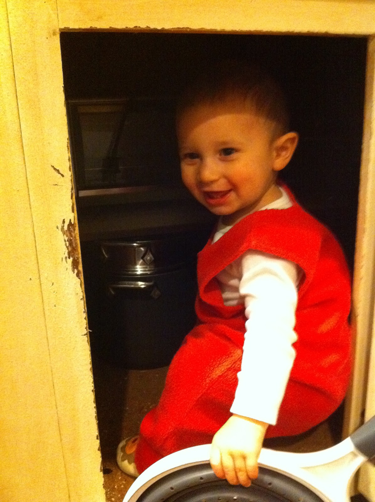 In the past week I have caught him climbing inside the fridge (you have seen pictures of this before!), figuring his way inside a cabinet where we keep pots, pans and the toaster: