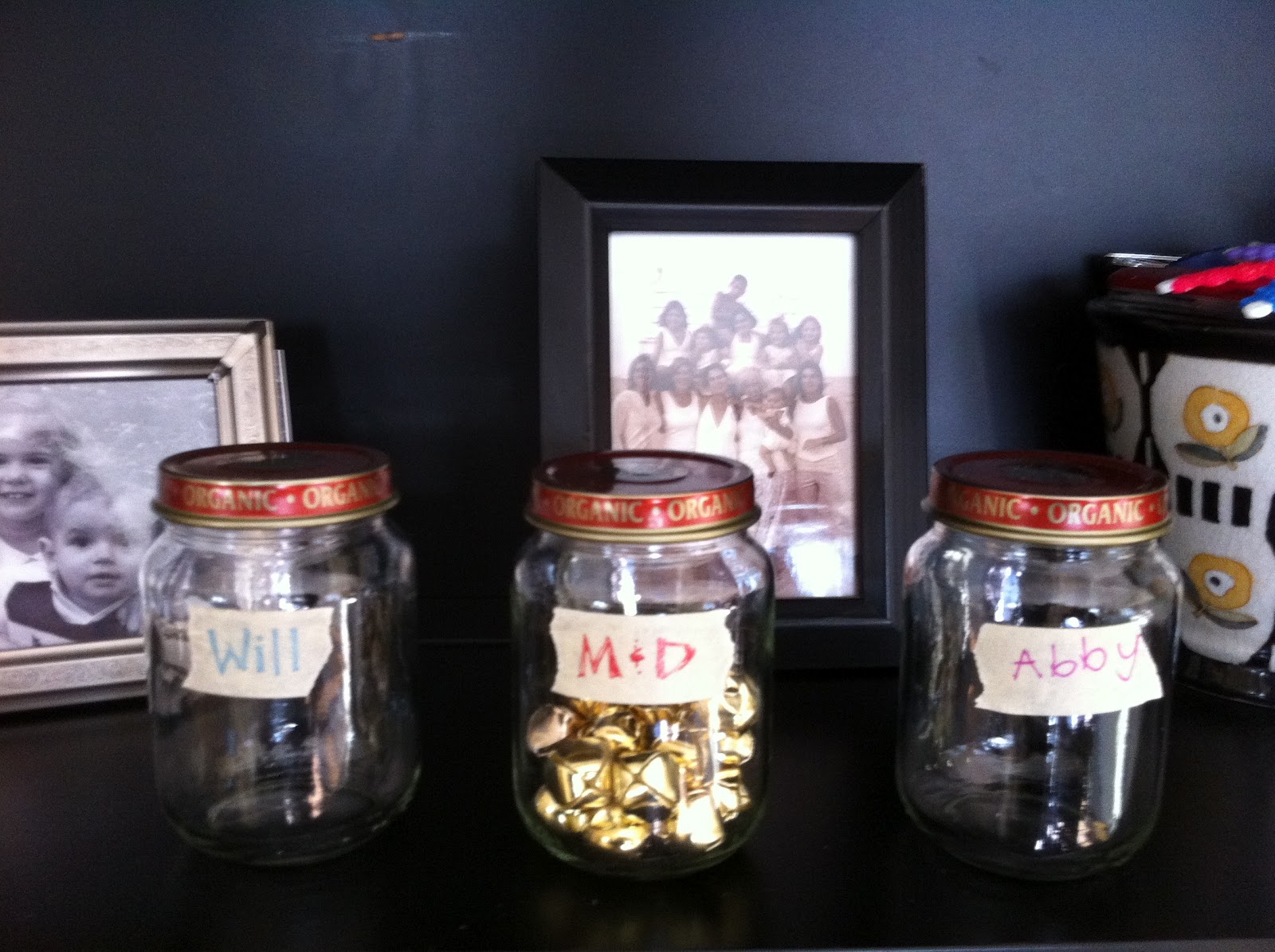 I love crafts and have a lot of things stored in our basement for when we’re inspired to do a project. I went down to the basement and grabbed a few baby food jars and some bells I had leftover from a Christmas craft a couple of years ago. I labeled the jars with masking tape – one for Will, one for Abby and one for me and Robert labeled “M&D.” Here are the rules and how it works: