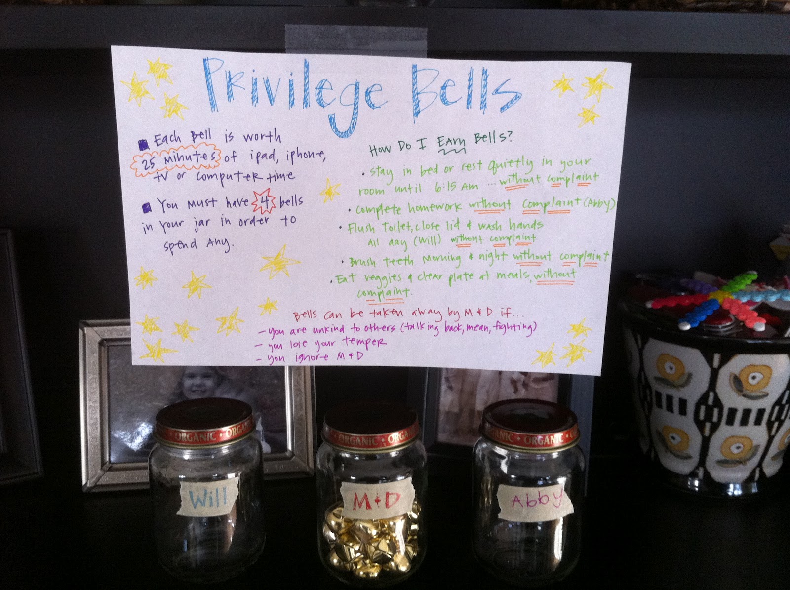A few weeks ago out of sheer desperation to make some changes around here, I came up with a little system that so far has been working like magic around our house. I call it “Privilege Bells.”