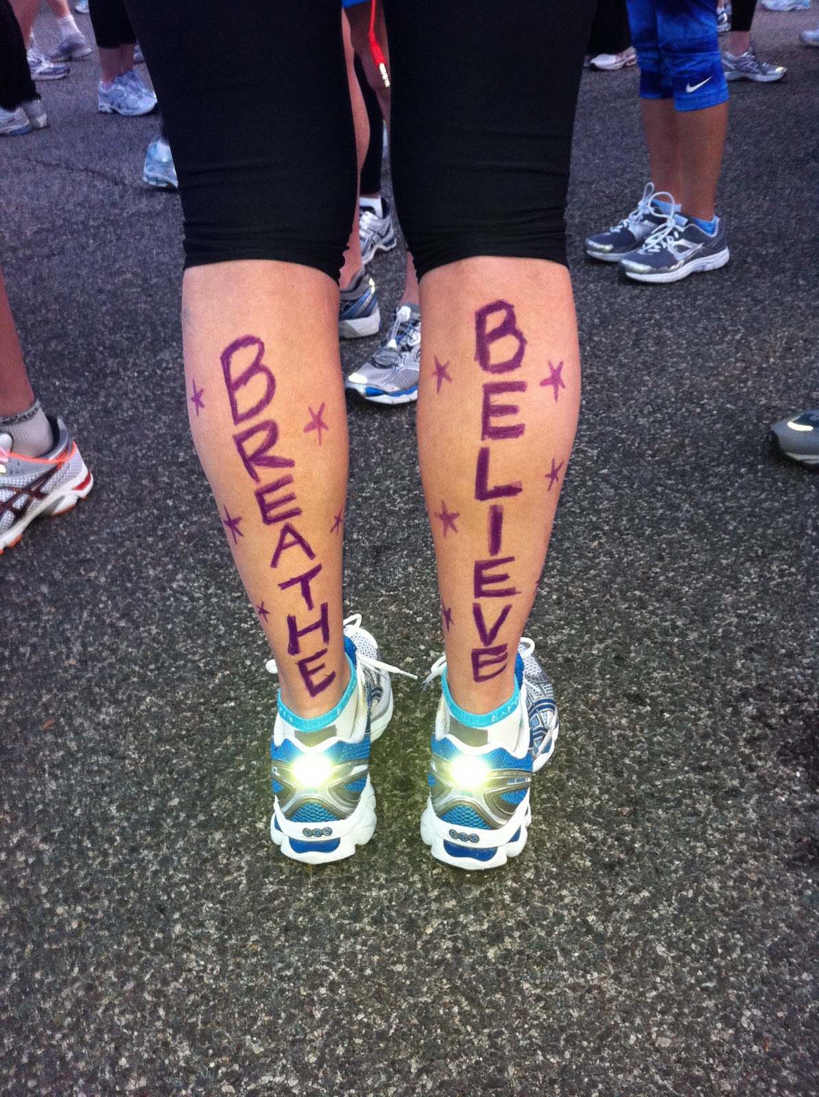 Do you have a favorite running mantra? Why does this work for you?: My mantra is run strong, breathe and believe. The only thing I have to remember to do while I run is to breathe and believe in myself. When I am feeling like giving up I say over and over in my head run strong, breathe and believe. For my races I always have my sister write “Breathe” on the back of one of my legs and “Believe” on the back of the other leg. It never fails — in every race I have people tell me how thankful they are to read those words! It makes me feel good to know that I am reminding others of these simple yet powerful things.