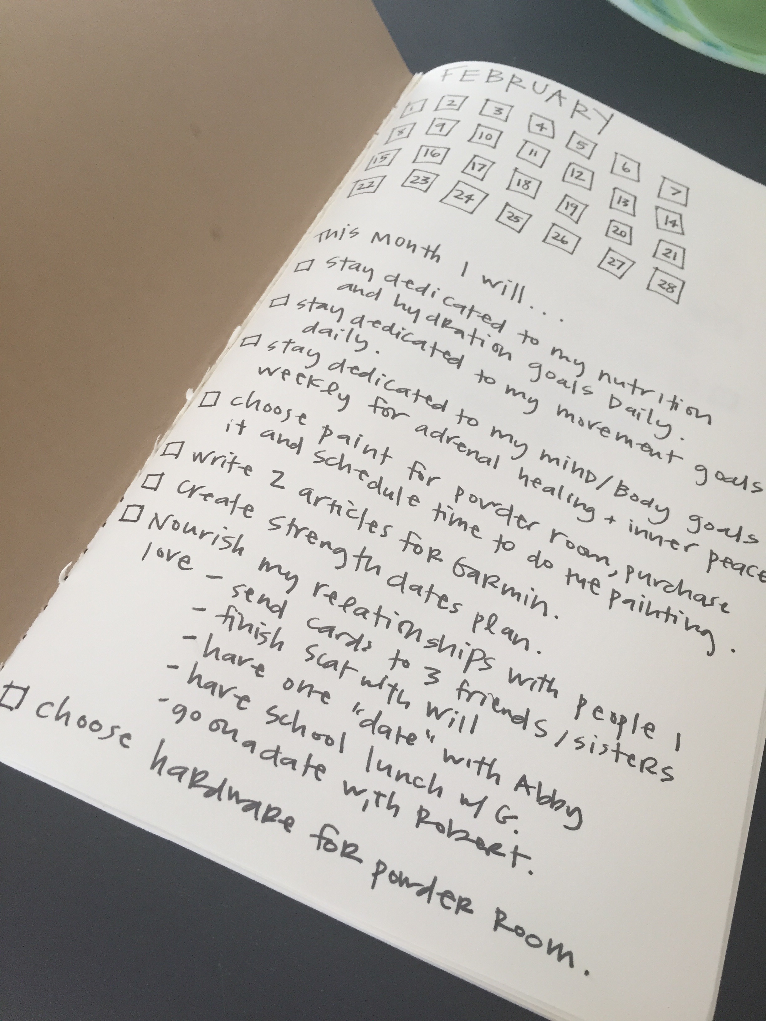 So there you have it. My February goals and intentions. I keep a notebook with this broken down monthly, weekly and then daily. It is helping me so much.