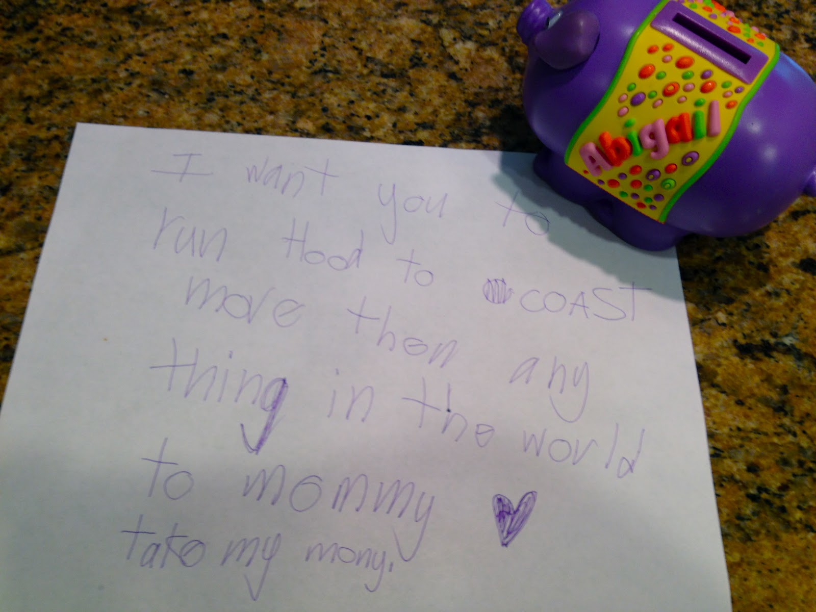 The other day, Abby noticed my envelope for the first time and asked me about it. I explained that I was saving money so I could get to Hood to Coast. She disappeared from the kitchen and a few minutes later, she came downstairs with her piggy bank and the following note: