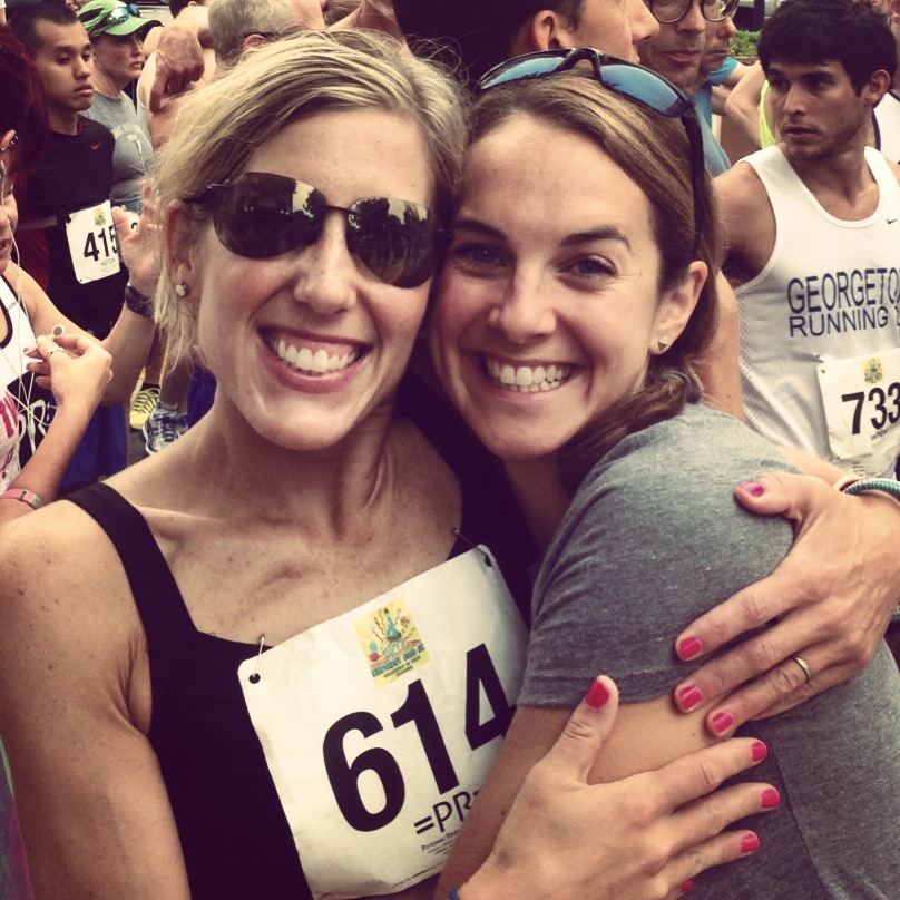 When we arrived at the race I went for a warm-up run along the course. I ran the whole thing from start to finish at an easy pace with a few strides in the last quarter mile to get my legs moving quicker. The course was hilly all throughout – lots of ups and downs the entire way. I knew it would be tough – it was HUMID outside and I was drenched in sweat from the warm up. I also noticed that my watch said I ran 3.2 miles for the warm up and I thought that was weird – maybe the course was long or I ran a little extra? I didn’t pay much mind to it though – I felt good and I was ready to race and see what I had in me. I saw my sister and Maddie as I waited in the start line and this made me SO happy. I am just so blessed with amazing people in my life.