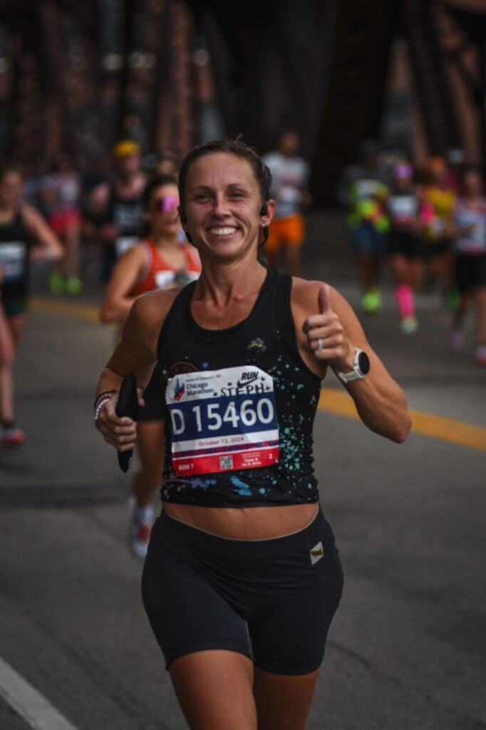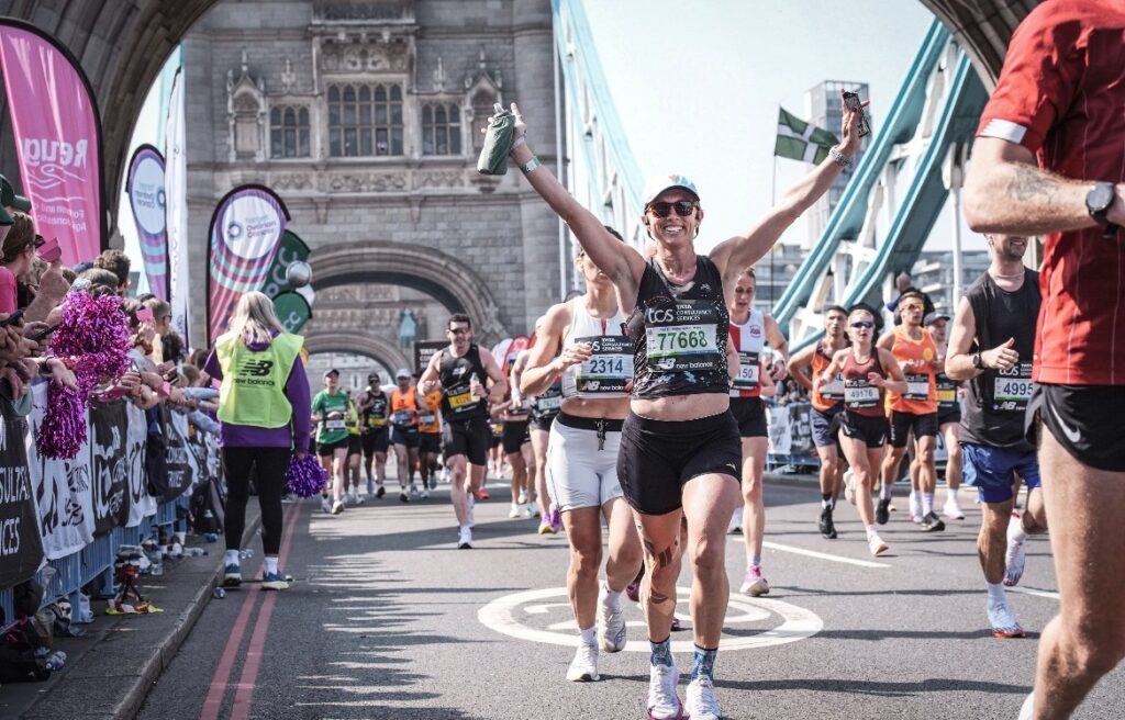 Coach Steph crossing the London Bridge while racing in 2025!