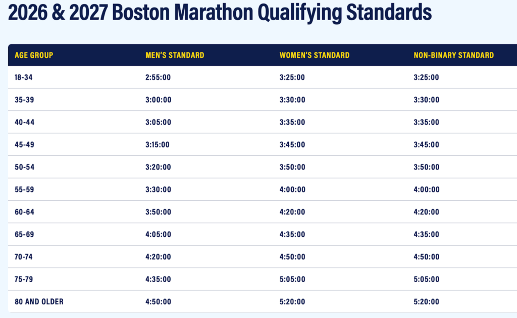 Recognized as the world’s oldest annual marathon, Boston is a unique major marathon as there is no general lottery- runners must either qualify for entry by meeting time standards or be accepted as a charity runner. The window for qualifying times for the 2026 race was open from Sep 1, 2024 – Sep 12, 2025. For the 2027 race, the qualifying window began on September 13, 2025 and will remain open until registration week (typically mid September). You can run multiple qualifying times, but you will only need to submit one. If you run a faster time than your qualifying before the January of race year, you will be able to resubmit your time for a faster seeded bib.