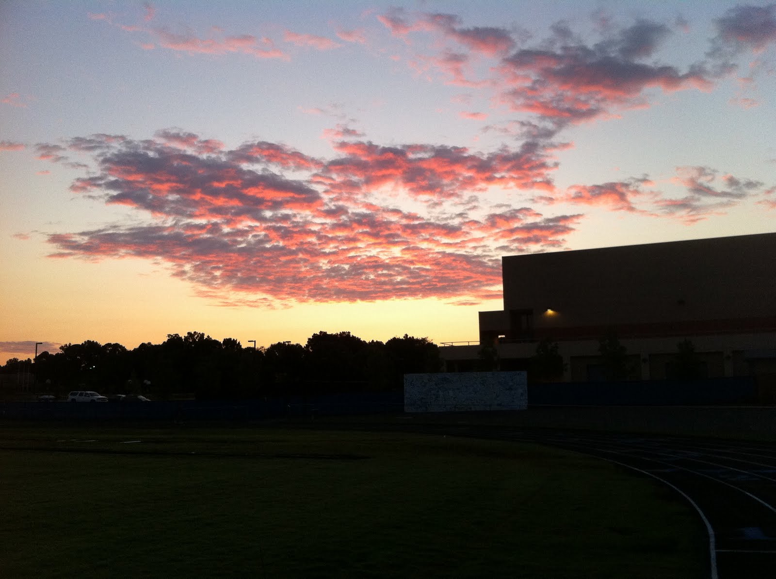 | pink puffy clouds at sunrise on the local high school track |