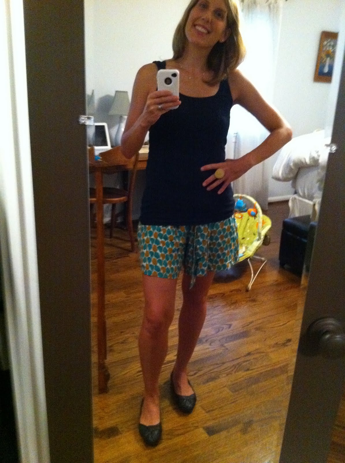 Guess where the tank tops are from? Yep, Target. I love them and they work with everything. This time I layered two black ones and wore them with my brand new shorts from the sale rack at Anthropologie. I love them. They are sooooo crazy comfy and cute. They have pears all over them. I think when fall rolls around they will look super cute with tights (maroon, maybe?) and boots. Maybe they will make another appearance on my blog in a few months. Anyway my favorite thing about them is that I got them for half of their original price. I’m also wearing black flats that might be my most comfortable non-running shoes. They’re the softest leather (made by Born) and I wear them all the time. I’ve had them for a little over a year and they are still in great shape.