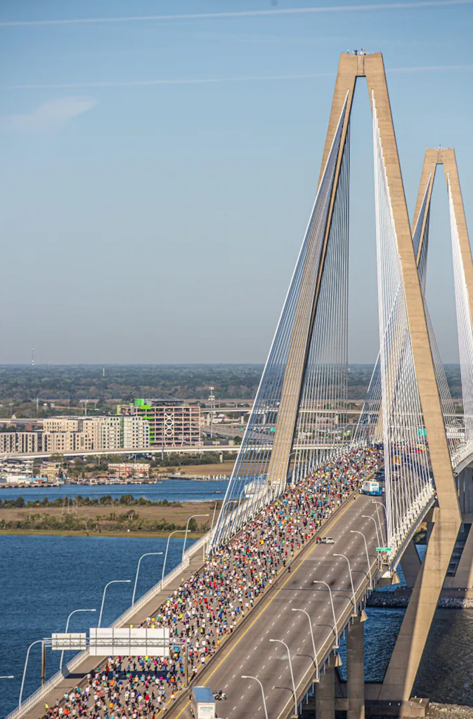 The Cooper River Bridge Run, held annually in flat Charleston, SC features 2.5 miles on the Arthur Ravenel Jr. bridge, a segment that includes a steep incline leveling out at a peak of nearly 250 ft.